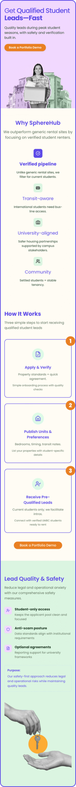 The previous site fell flat and didn’t prioritize user needs. The biggest challenge was designing for three unique audiences on one platform. Students needed a friendly experience; landlords needed results; universities prioritized security.